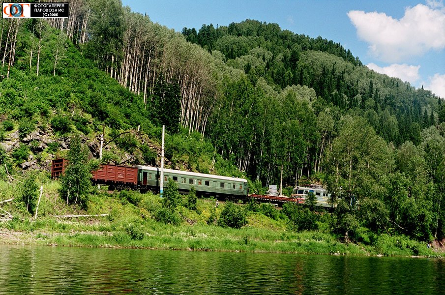 - В названии я написал "тихонько крадется", потому что поезд шел медленно, я в это время купался и его не услышал, когда заметил и навел фотоаппарат, ВЛ60К уже почти скрылся за деревьями