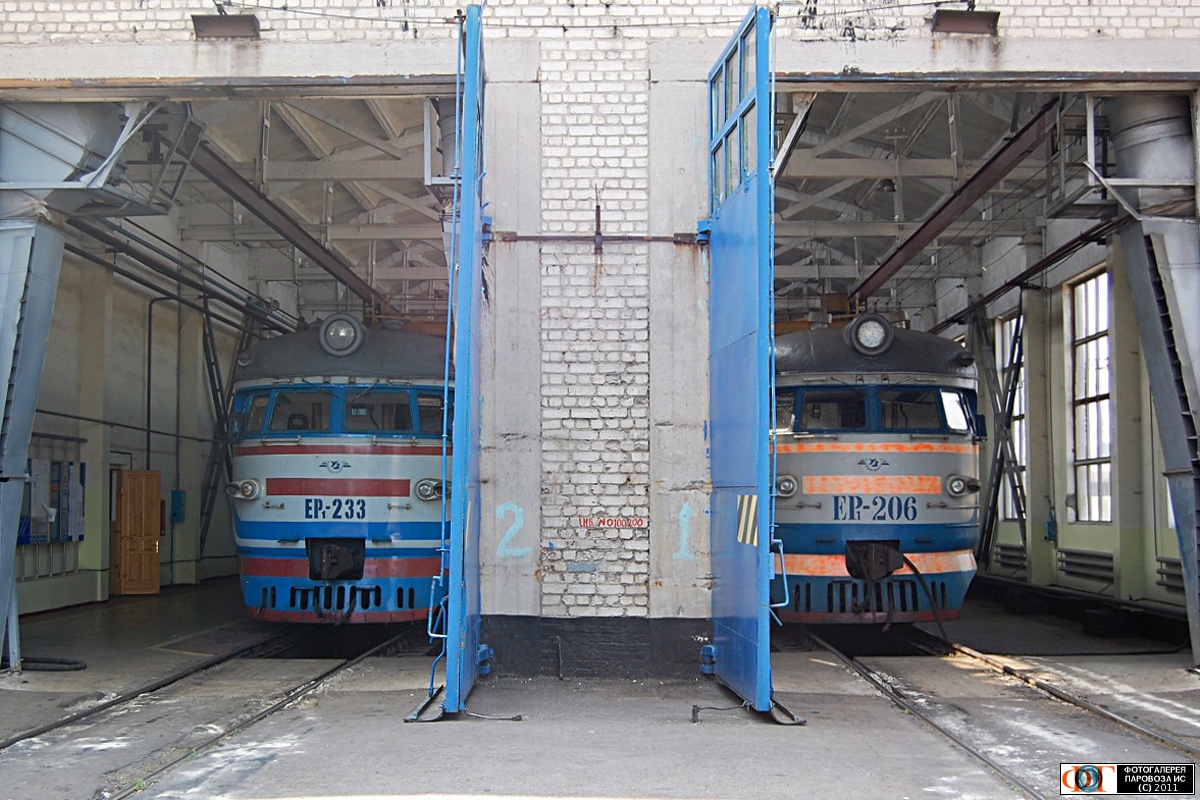 | Электропоезда ЭР1-233 и ЭР1-206, депо Запорожье-II, Запорожская обл. Автор: Фёдор Яшин† | Фото сделано 30.VI.2008, опубликовано 9.XII.2011.