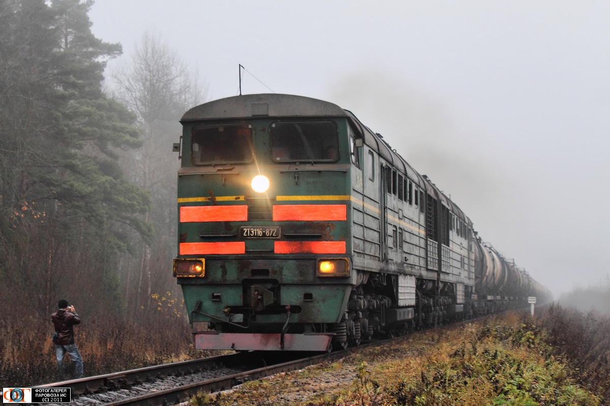 | Тепловоз 2ТЭ116-872 с грузовым поездом на о.п. Редья, перегон Парфино - Старая Русса, Новгородская обл. Автор: Дмитрий Васильев | Фото сделано 4.XI.2011, опубликовано 6.XII.2011.