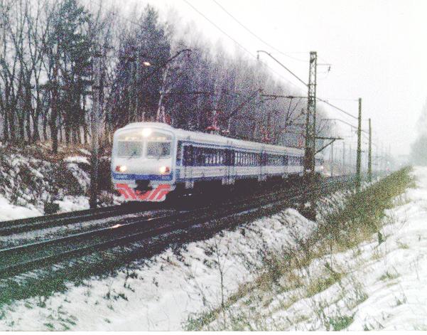| Электропоезд ЭД4МК-0028 { ED4MK-0028 EMU train }, пл. Заветы Ильича { Zavety Ilyicha station }, Московская обл. Автор: Константин Терлецкий | Фото сделано ????, опубликовано до 03.VIII.2001.