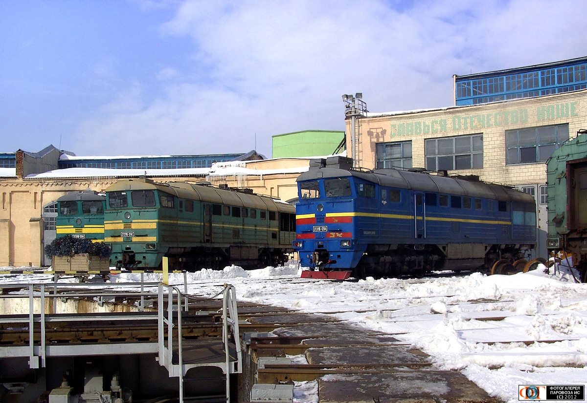 | Тепловозы 2ТЭ116-1244, 2ТЭ116-1242, 2ТЭ116-1284, ТЧ-11 Конотоп, Сумская обл. Автор: Движенец В. | Фото сделано 23.II.2010, опубликовано 9.I.2012.