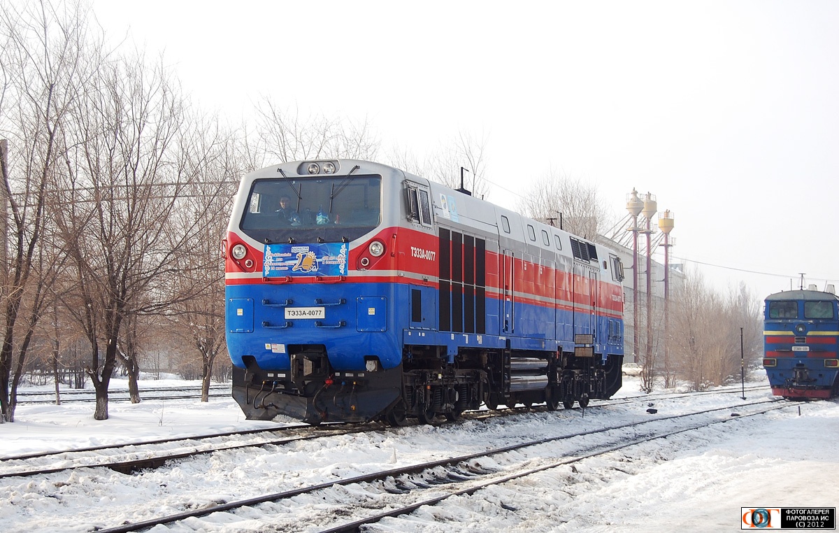 | Тепловоз ТЭ33А-0077 в ТЧ-28, г. Алматы, Алма-Ата Автор: Гольбрайхт М. | Фото сделано 11.II.2012, опубликовано 13.II.2012.