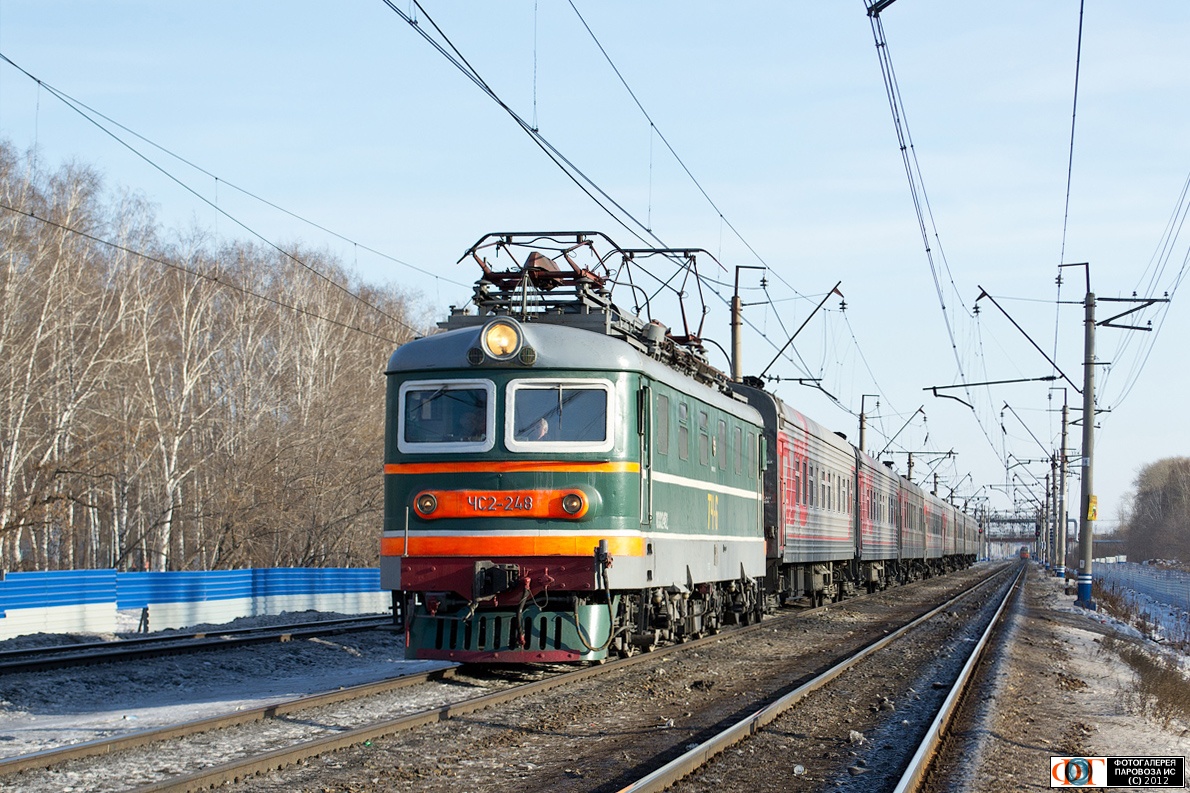 | Электровоз ЧС2-248 (приписки ТЧЭ-6 Свердловск-Пасс.), перегон Войновка - Тюмень Свердловской ж.д., Тюменская обл. Автор: Зайнуллин Ринат | Фото сделано 25.II.2012, опубликовано 1.III.2012.