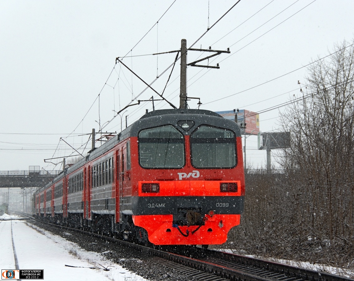 | "Редкая птица". Электропоезд ЭД4МК-0099, перегон Путёвка (парк ст. Шарташ) - Аппаратная, Екатеринбург, Свердловская обл. Автор: IAGSoft | Фото сделано 1.IV.2012, опубликовано 2.IV.2012.