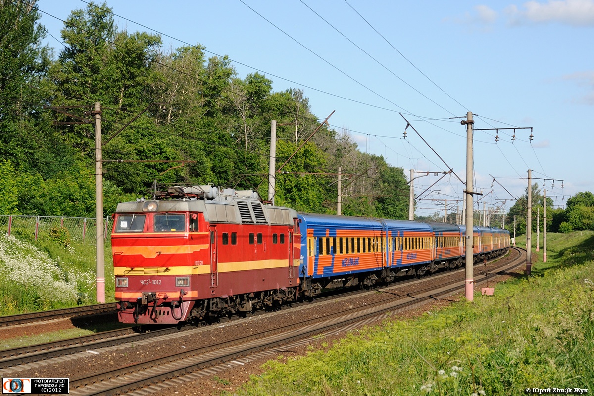 | Электровоз ЧС2Т-1012 с поездом № 019 "Мегаполис" на участке Подрезково - Новоподрезково перегона Сходня - Химки, Московская обл. Автор: Юрий Жук | Фото сделано 18.VI.2012, опубликовано 27.VI.2012.