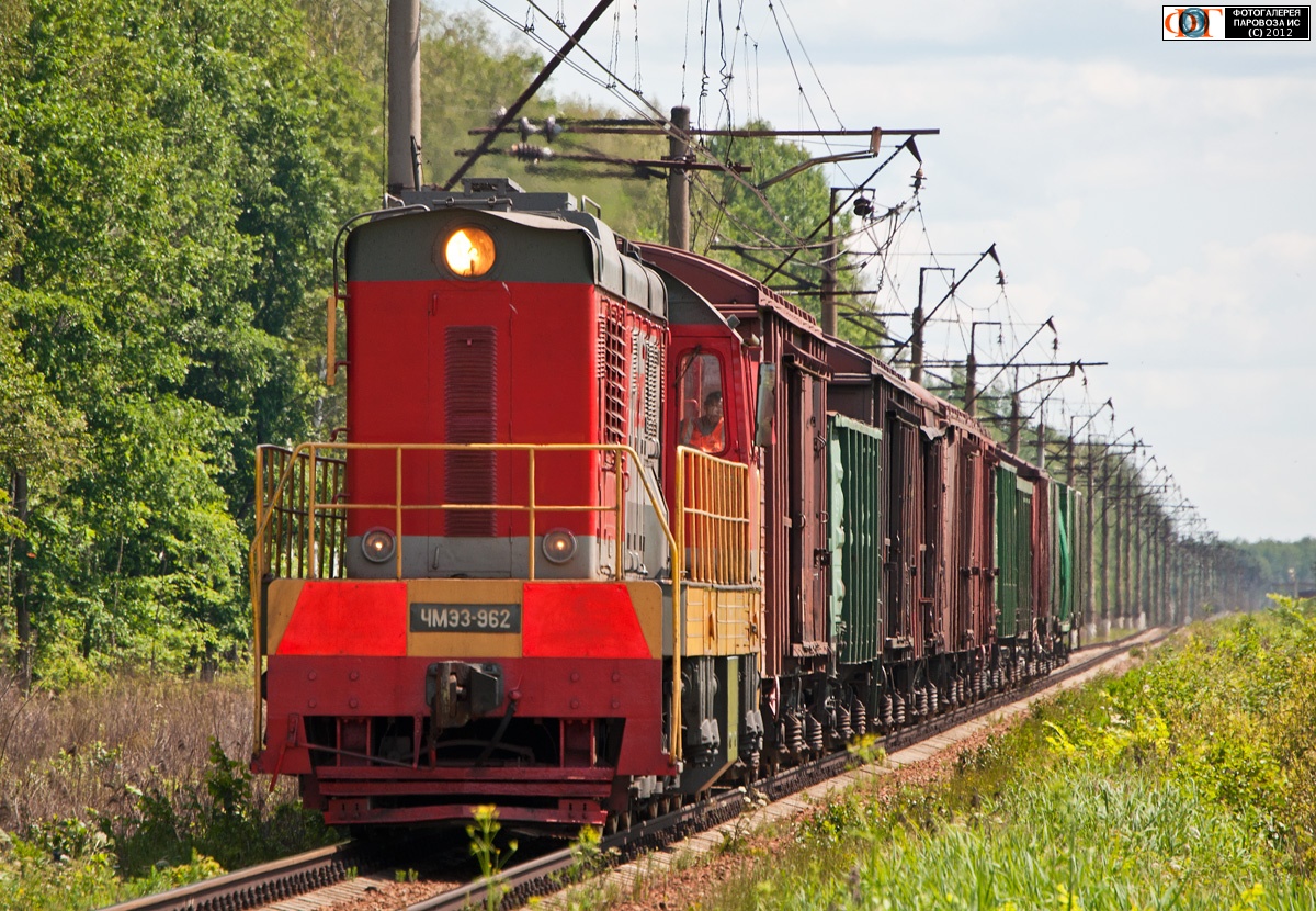 | Тепловоз ЧМЭ3-962 с грузовым поездом, участок платформа 119 км - Карманово перегона Соревнование - Большая Волга, Московская обл. Автор: Тёмыч | Фото сделано 1.VII.2012, опубликовано 7.VII.2012.
