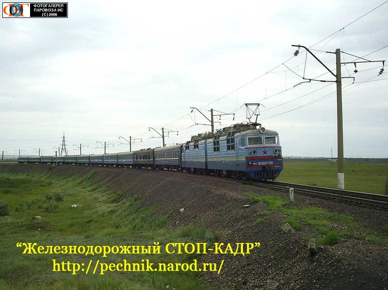 | Электровоз ВЛ80С-381 со скорым поездом Павлодар - Алматы { VL80S-381 electric locomotive }, перегон Караганда-Сорт. - Жана-Караганды { Karaganda-Sort. - Zhana-Karagandy stretch }, Карагандинская область Автор: Уткин Михаил † | Фото сделано 15.VII.2006, опубликовано 24.VII.2006.