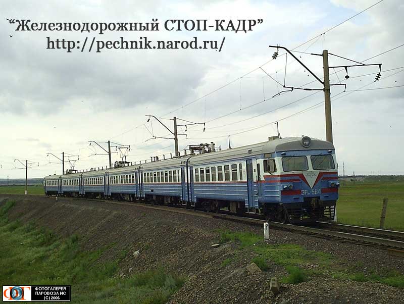 | Электропоезд ЭР9М-584 (сзади - наполнитель ЭР9М-401901) { ER9M-584 EMU train }, перегон Караганда-Сорт. - Жана-Караганды { Karaganda-Sort. - Zhana-Karagandy stretch }, Карагандинская область Автор: Уткин Михаил † | Фото сделано 15.VII.2006, опубликовано 24.VII.2006.