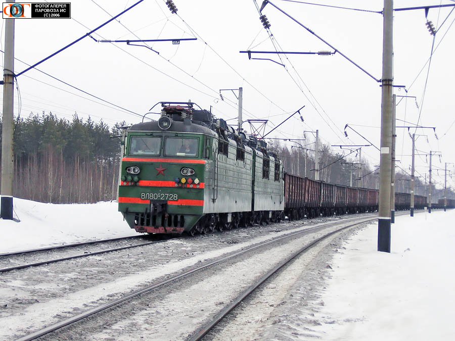 | Электровоз ВЛ80С-2728 { VL80S-2728 electric locomotive }, перегон Муром-Кольдино { Murom-Koldino stretch }, Владимирская обл. Автор: Терентьев О. | Фото сделано 23.III.2006, опубликовано 1.VIII.2006.