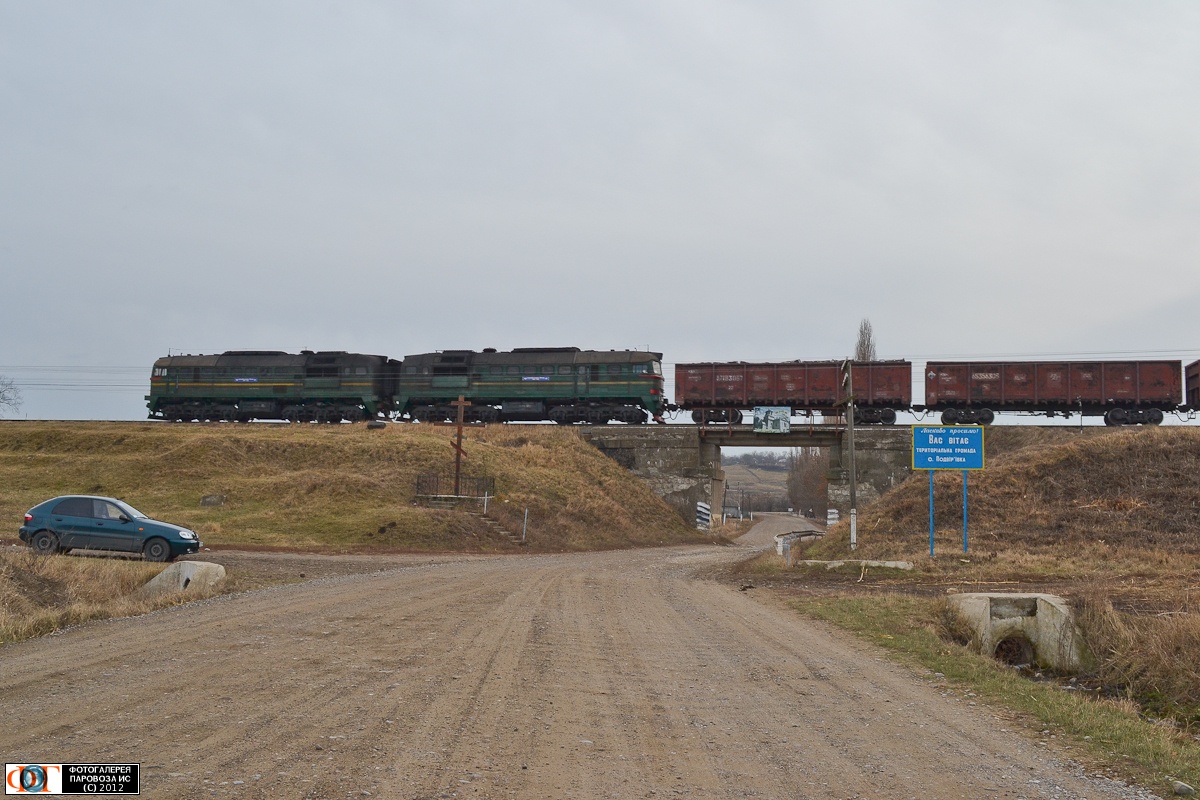 | Тепловоз 2М62 с грузовым поездом на перегоне Липкань - Ларга, Черновицкая обл. Автор: ВикторБГ | Фото сделано 6.XII.2011, опубликовано 16.X.2012.