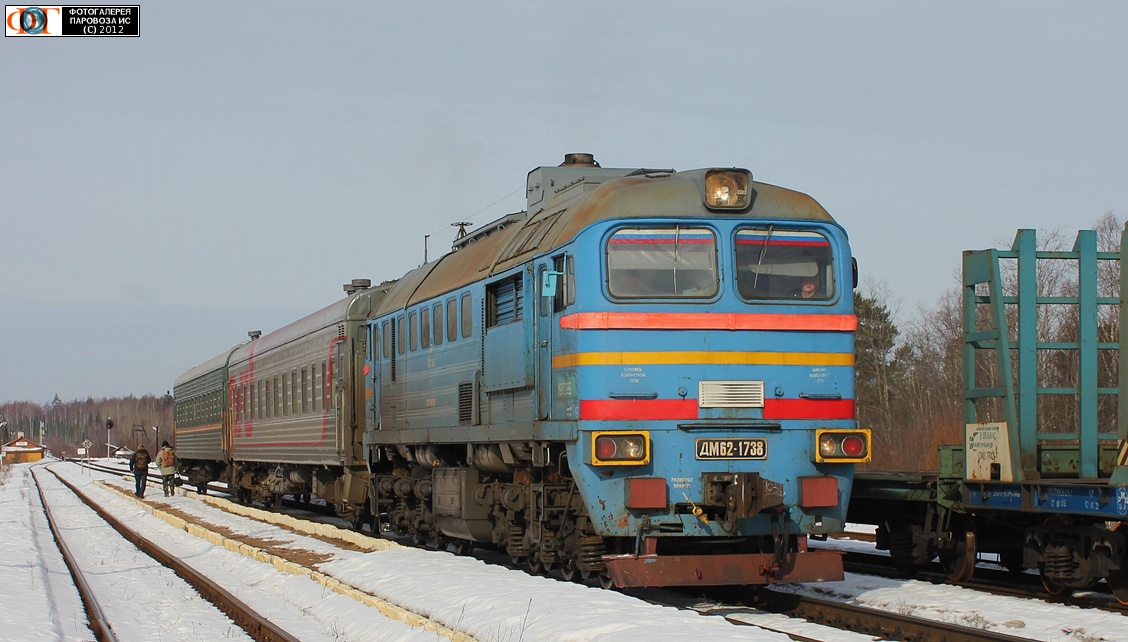 | Тепловоз М62-1738 (ДМ62-1738) с пригородным поездом, станция Тальцы-Мологские, Новгородская обл. Автор: Мaшинистов Андрей | Фото сделано 24.III.2012, опубликовано 26.XI.2012.