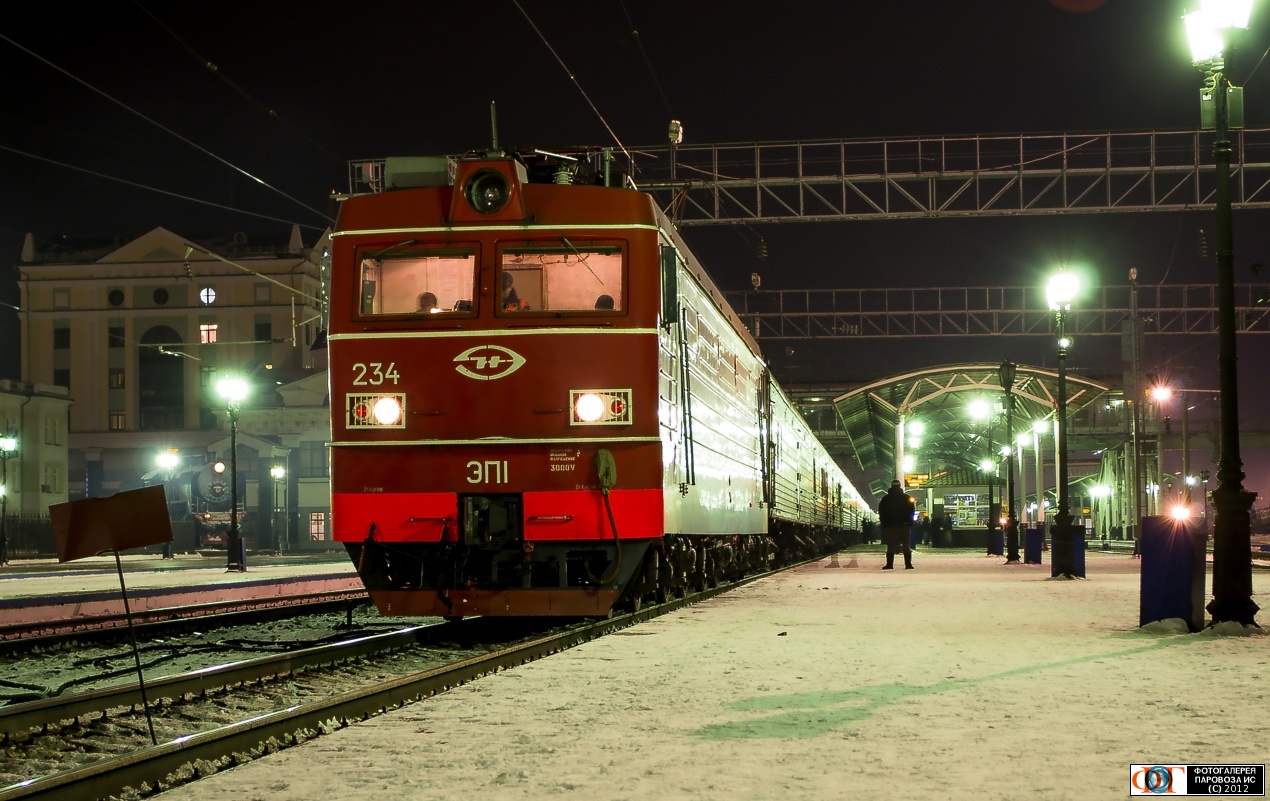 | Электровоз ЭП1-234 с пассажирским поездом №43 Хабаровск - Москва, станция Красноярск, Красноярский край Автор: Михаил Азарцев | Фото сделано 23.XI.2012, опубликовано 28.XI.2012.