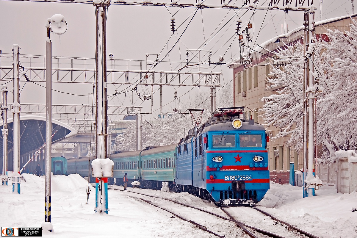 | Электровоз ВЛ80С-2564 (ТЧ-30 Шу) c пассажирским поездом КТЖ №9 Алматы — Астана на станции Алма-Ата-I, Алма-Ата Автор: Alexandr Zaleskiy | Фото сделано 3.XII.2012, опубликовано 8.XII.2012.