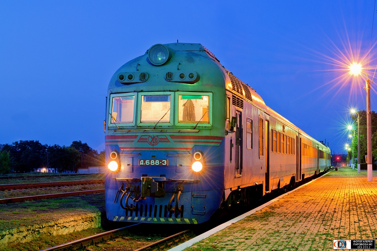 | Дизель-поезд Д1-688 на станции Новомиргород, Кировоградская обл. Автор: SvIva | Фото сделано 25.VIII.2012, опубликовано 8.XII.2012.