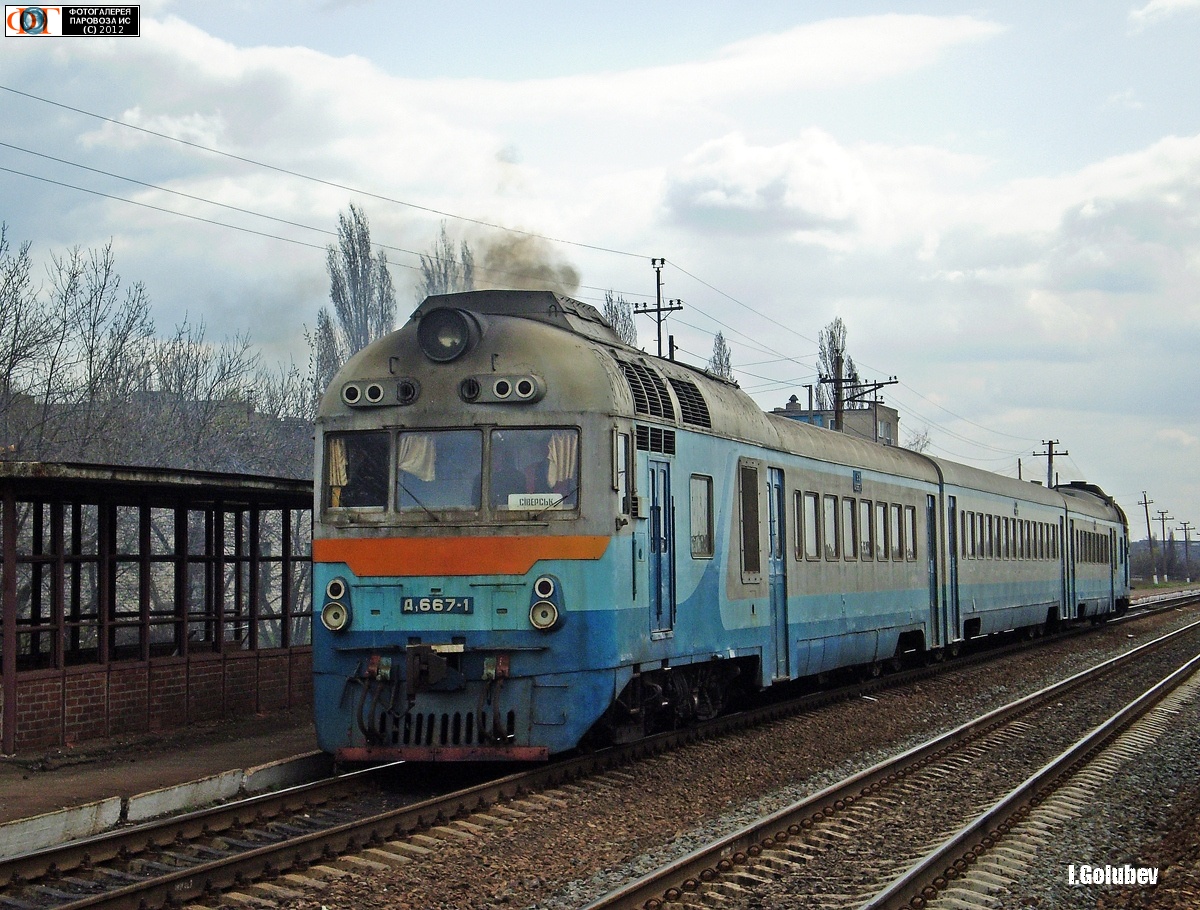 | Дизель-поезд Д1-667 сообщением Попасная - Северск на станции Попасная-II, Луганская обл. Автор: CraZy Man | Фото сделано 18.IV.2010, опубликовано 23.XII.2012.