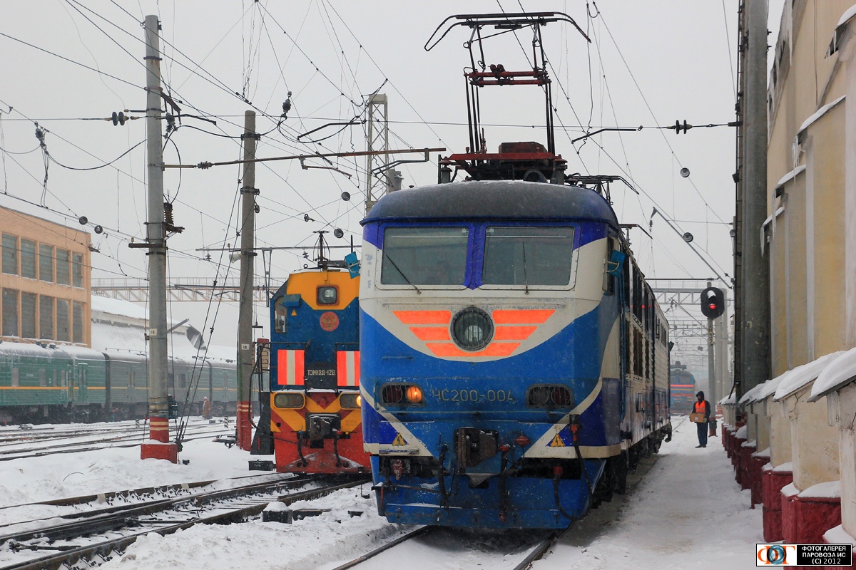 | Электровоз ЧС200-004 и тепловозы ТЭМ18Д-128 и ДМ62-1808 на ст. Москва-Пассажирская, Октябрьская ж.д., Москва Автор: Нико | Фото сделано 26.XII.2011, опубликовано 14.I.2013.