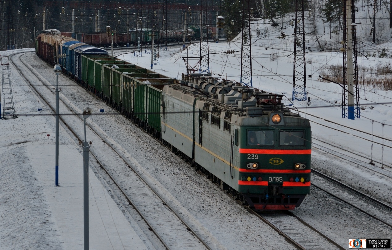 | Электровоз ВЛ85-239 с грузовым поездом, станция Сорокино, Красноярский край Автор: Михаил Азарцев | Фото сделано 16.I.2013, опубликовано 20.I.2013.