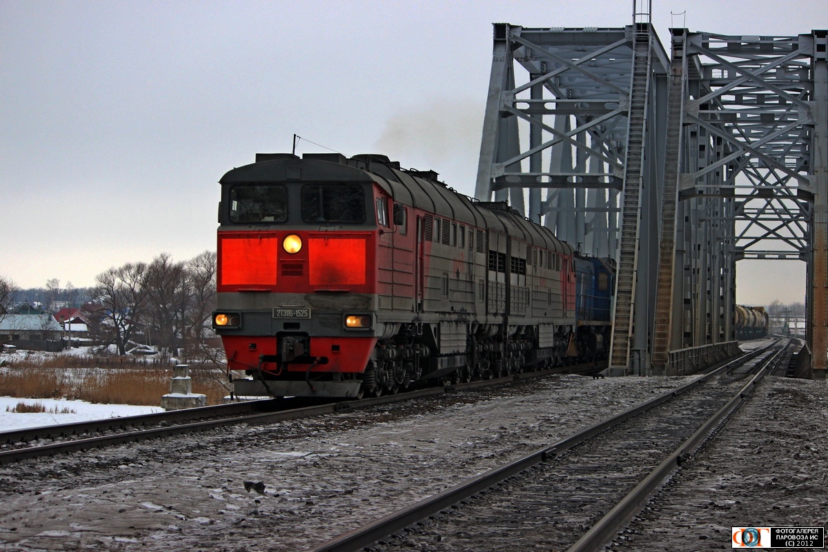 | Тепловоз 2ТЭ116-1525 с грузовым поездом следует по перегону Цна - Рада, ЮВЖД, Тамбовская обл. Автор: Александр | Фото сделано 2.II.2013, опубликовано 3.II.2013.