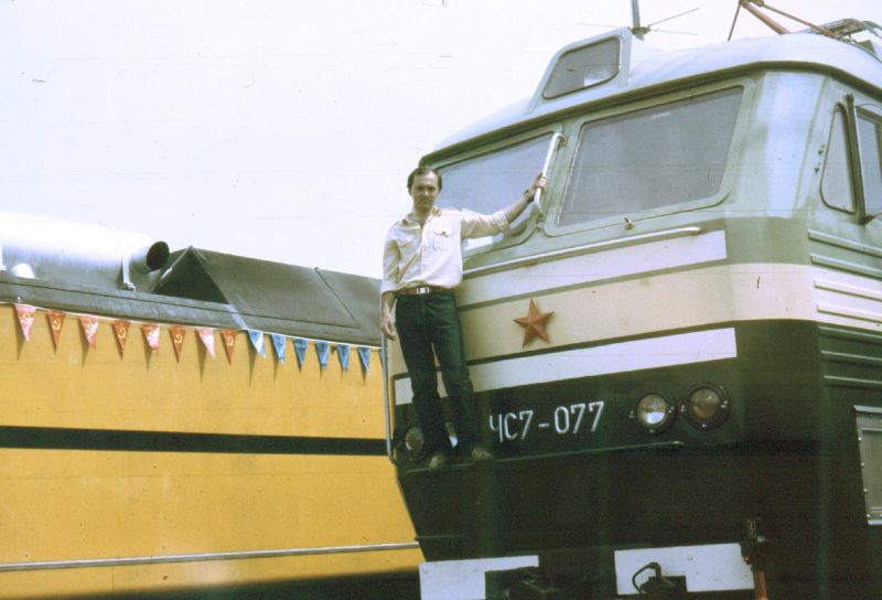 | Электровоз ЧС7-077 { ChS7-077 electric locomotive }, выставка "Железнодорожный Транспорт - 86", Щербинка { "Railway Transport' 86" exhibition, Shcherbinka }, Москва Автор: Хвостов Сергей | Фото сделано 1986 г, опубликовано 5.I.2004.