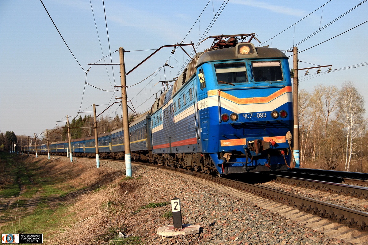 | Электровоз ЧС7-093 с поездом №61 Москва - Николаев на перегоне Воротынск - Бабынино, Калужская обл. Автор: Денис | Фото сделано 2.V.2013, опубликовано 4.V.2013.
