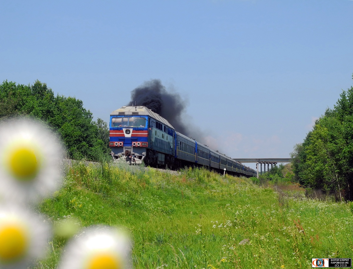 | Тепловоз ТЭП70-0221 с пассажирским поездом на перегоне Нежин - Лосиновка, Черниговская обл. Автор: Бодька К. | Фото сделано VII.2013, опубликовано 20.VIII.2013.