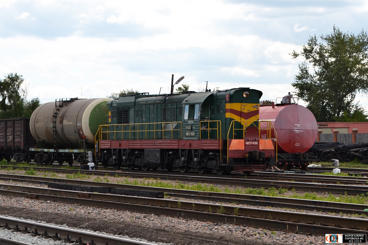 | Тепловоз ЧМЭ3-4586 с вагонами на станции Йошкар-Ола, Марий Эл Автор: albo | Фото сделано 30.VII.2012, опубликовано 31.VIII.2013.
