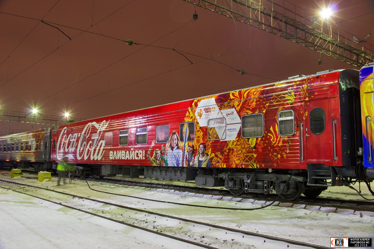 | Фирменный вагон "Coca-Cola" в составе поезда "Эстафета Олимпийского огня Сочи 2014", станция Екатеринбург-Пассажирский, Свердловская обл. Автор: Кирилл Широков | Фото сделано 13.XII.2013, опубликовано 18.XII.2013.