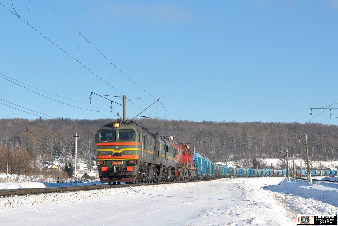 | Тепловоз 2М62-0991 с грузовым поездом на перегоне Духовская - Смоленск-Сортировочный, Смоленская обл. Автор: Владислав Фоменко | Фото сделано 24.I.2014, опубликовано 27.I.2014.