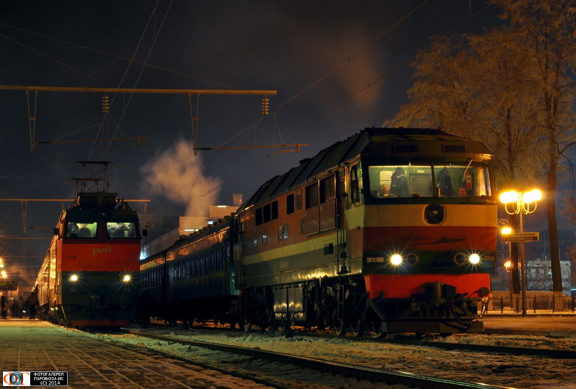 | Тепловоз ТЭП70-0265 и электровоз ЧС4Т-672 на станции Орша-Центральная, Витебская обл. Автор: Владислав Фоменко | Фото сделано 27.I.2014, опубликовано 11.II.2014.