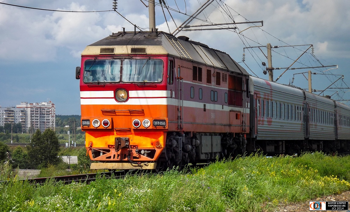 | Тепловоз ТЭП70-0555 с пассажирским поездом №360 Калининград - Адлер следует по перегону Брянск-Орловский - Брянск-Льговский, Брянская обл. Автор: [RDB]zenit | Фото сделано 25.VII.2013, опубликовано 28.II.2014.