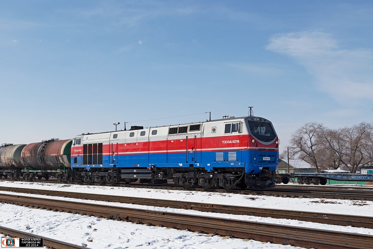 | Тепловоз ТЭ33А-0216 с грузовым поездом на станции Жетыген, Алма-Атинская область Автор: Alexandr Zaleskiy | Фото сделано 10.III.2014, опубликовано 12.III.2014.