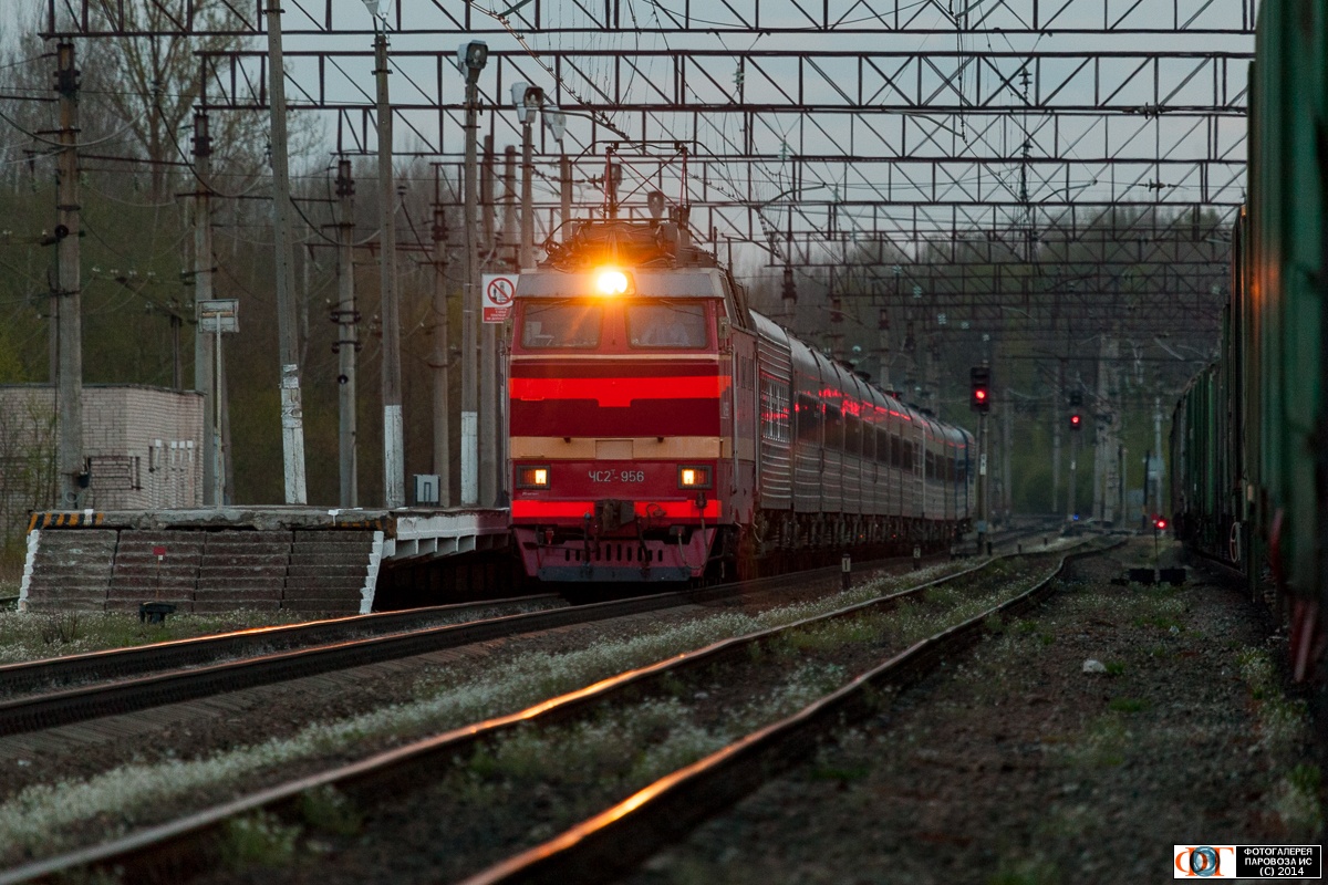 | Электровоз ЧС2Т-956 с поездом Великий Новгород - Москва, станция Подберезье, Новгородская обл. Автор: Mikhail Krivyy † | Фото сделано 8.V.2014, опубликовано 10.V.2014.