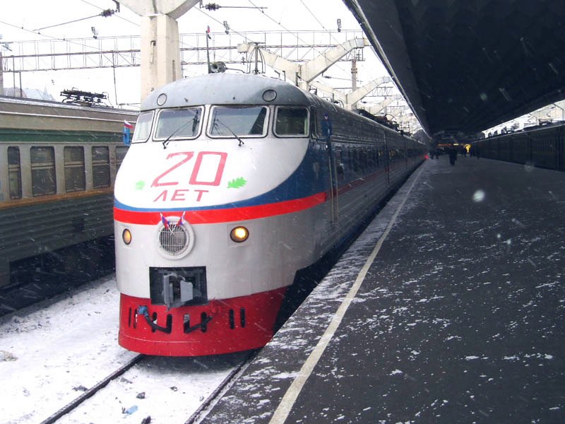| Электропоезд ЭР200 { ER200 EMU train }, Московский вокзал { Moskovsky terminal }, Санкт-Петербург Автор: Мадаев | Фото сделано 1.III.2004, опубликовано 5.III.2004.