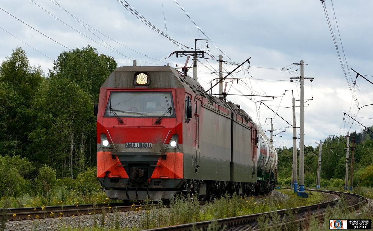 | Электровоз 2ЭС10-038 с грузовым поездом, перегон Чайковская - Шабуничи, Пермский край Автор: Михаил Азарцев | Фото сделано 27.VII.2014, опубликовано 3.VIII.2014.