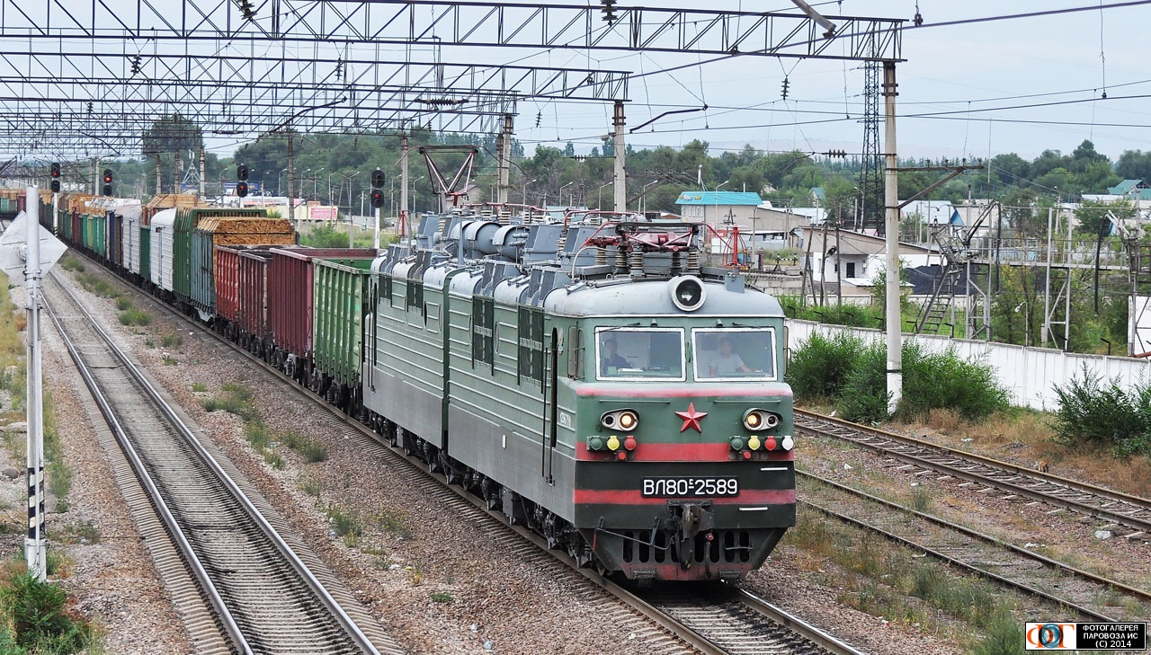 | Электровоз ВЛ80С-2589 с грузовым поездом на станции Чемолган, Алма-Атинская область Автор: Гольбрайхт М. | Фото сделано 16.VIII.2014, опубликовано 27.VIII.2014.