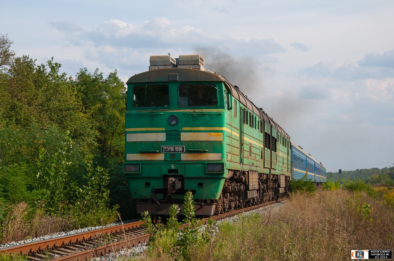 | Тепловоз 2ТЭ116-1096 с пригородным поездом Апостолово - Днепропетровск-Южный, перегон Сурское - Встречный, Днепропетровская обл. Автор: Vyacheslav | Фото сделано 7.IX.2014, опубликовано 14.IX.2014.