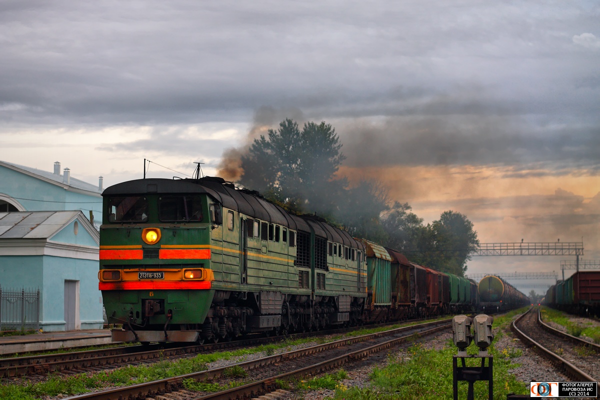 | Тепловоз 2ТЭ116-935 (2ТЭ116-359) с грузовым поездом на станции Старая Русса, Новгородская обл. Автор: Дмитрий Васильев | Фото сделано 29.VIII.2014, опубликовано 27.X.2014.