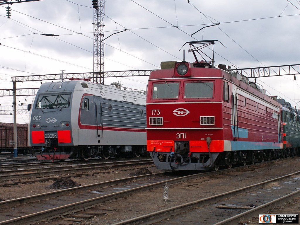 | Электровозы ЭП1-173 и 2ЭС5К-003 { EP1-173 and 2ES5K-003 electric locomotives }, депо Улан-Удэ { Ulan-Ude depot }, Бурятия Автор: Жанчипов Е. | Фото сделано 16.IV.2006, опубликовано 8.X.2006.