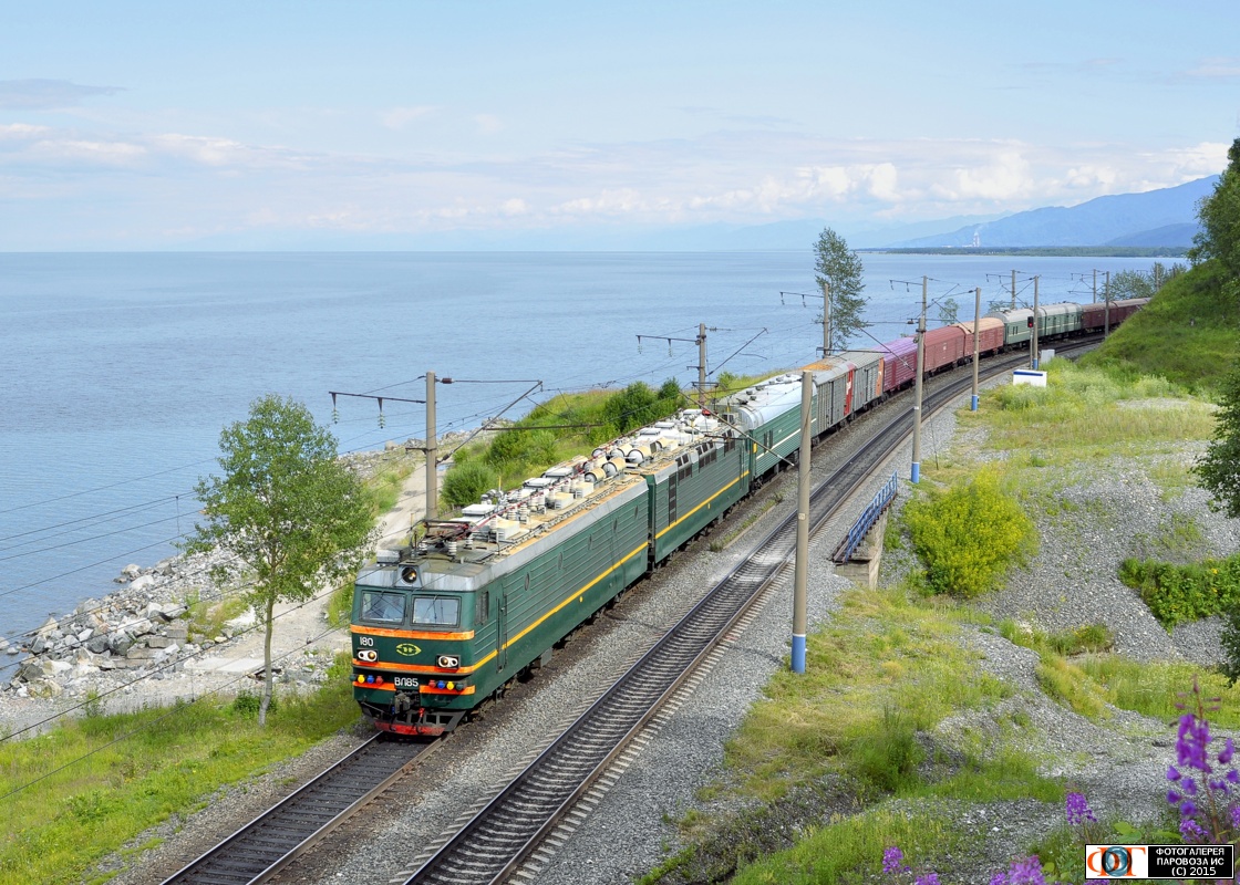 | Электровоз ВЛ85-180 с грузовым поездом на перегоне Утулик - Слюдянка-I, Иркутская обл. Автор: Владислав Фоменко | Фото сделано 2.VIII.2014, опубликовано 21.I.2015.