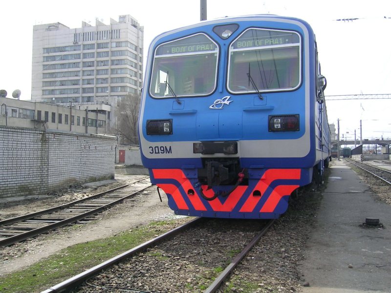 | Электропоезд ЭД9М-100x (?) { ED9M-100x (?) EMU train }, ст. Волгоград-I { Volgograd-I station }, Волгоградская обл. Автор: Плотников П. | Фото сделано 9.IV.2004, опубликовано 11.IV.2004.
