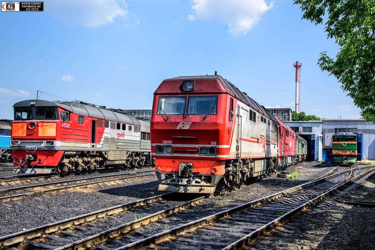 | Тепловоз ТЭП70У-010, а также 2ТЭ116-656, 2ТЭ116-275 и другие перед цехом ТО-3 и ТР-1 грузовых тепловозов СЛД-67 Тюмень, Тюменская обл. Автор: Alexander495. | Фото сделано 3.VI.2015, опубликовано 8.VI.2015.