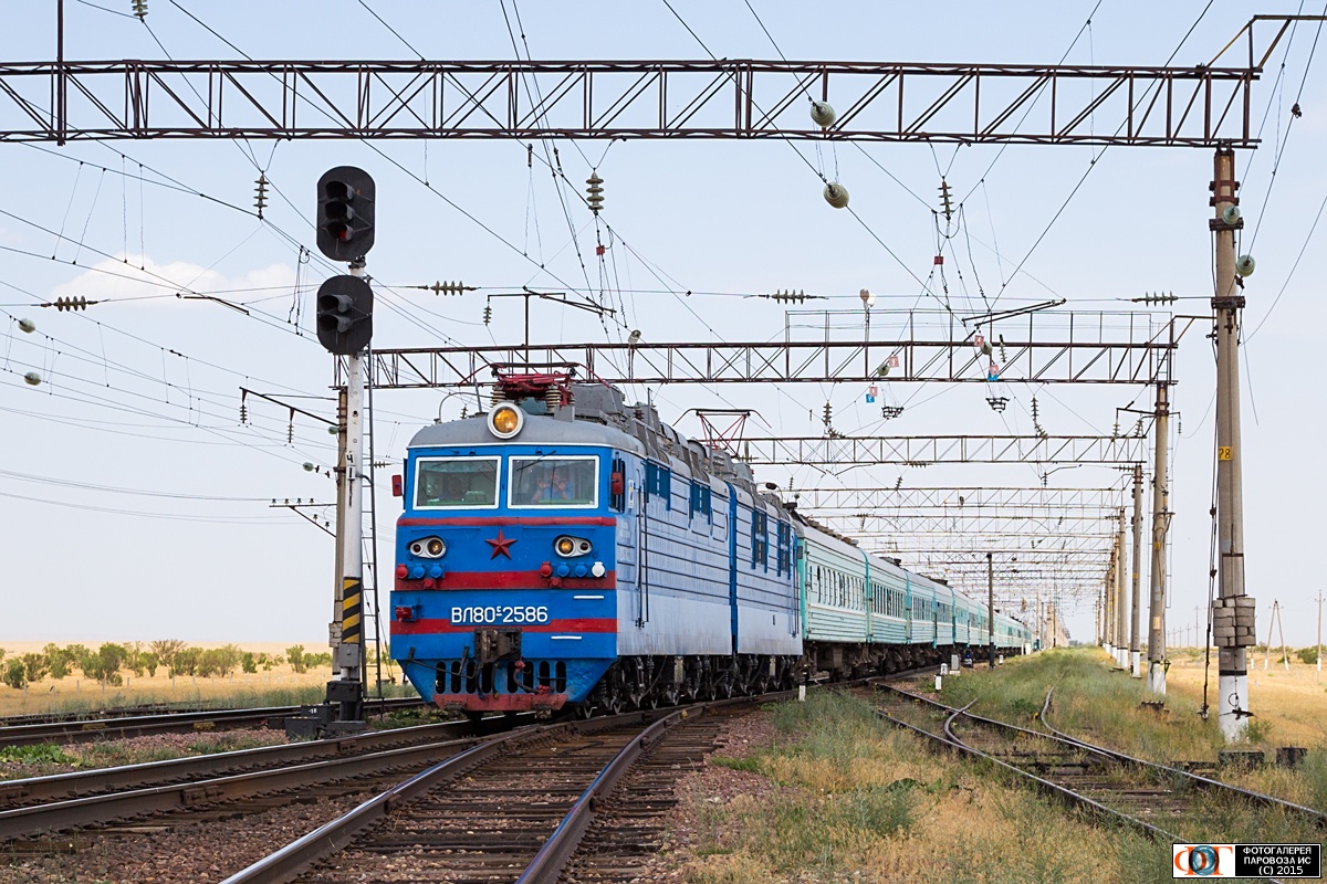 | Электровоз ВЛ80С-2586 с пассажирским поездом № 3 Алма-Ата-II - Астана на станции Чильбастау, Алма-Атинская область Автор: Alexandr Zaleskiy | Фото сделано 7.VI.2015, опубликовано 9.VI.2015.