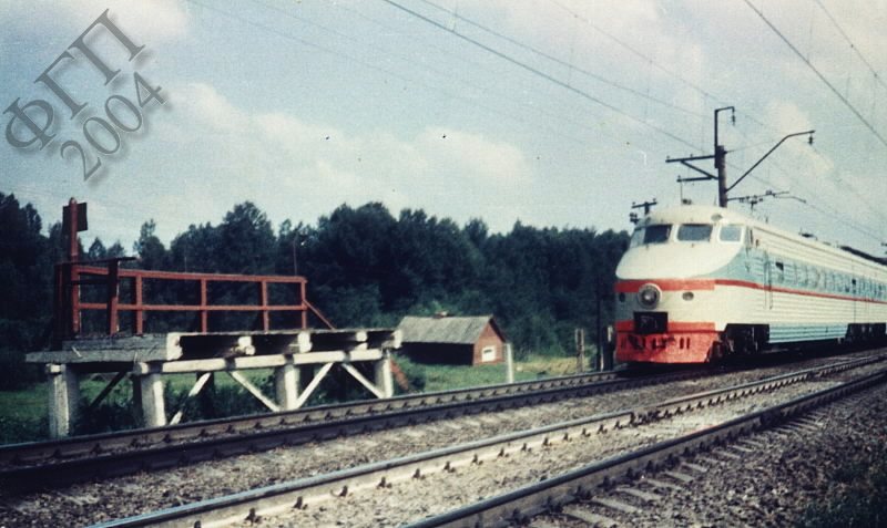 | Электропоезд ЭР200 { ER200 EMU train }, о.п. 157 км { 157 km station }, перегон Большая Вишера - Малая Вишера, Новгородская обл. Автор: 249 | Фото сделано 198?, опубликовано до 03.VIII.2001.