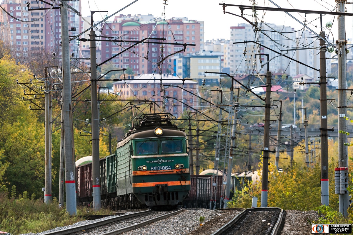 | Электровоз ВЛ10У-864 с грузовым поездом на перегоне Уфа - Черниковка, Башкортостан Автор: Скворцов М.В. † | Фото сделано 20.IX.2015, опубликовано 1.X.2015.