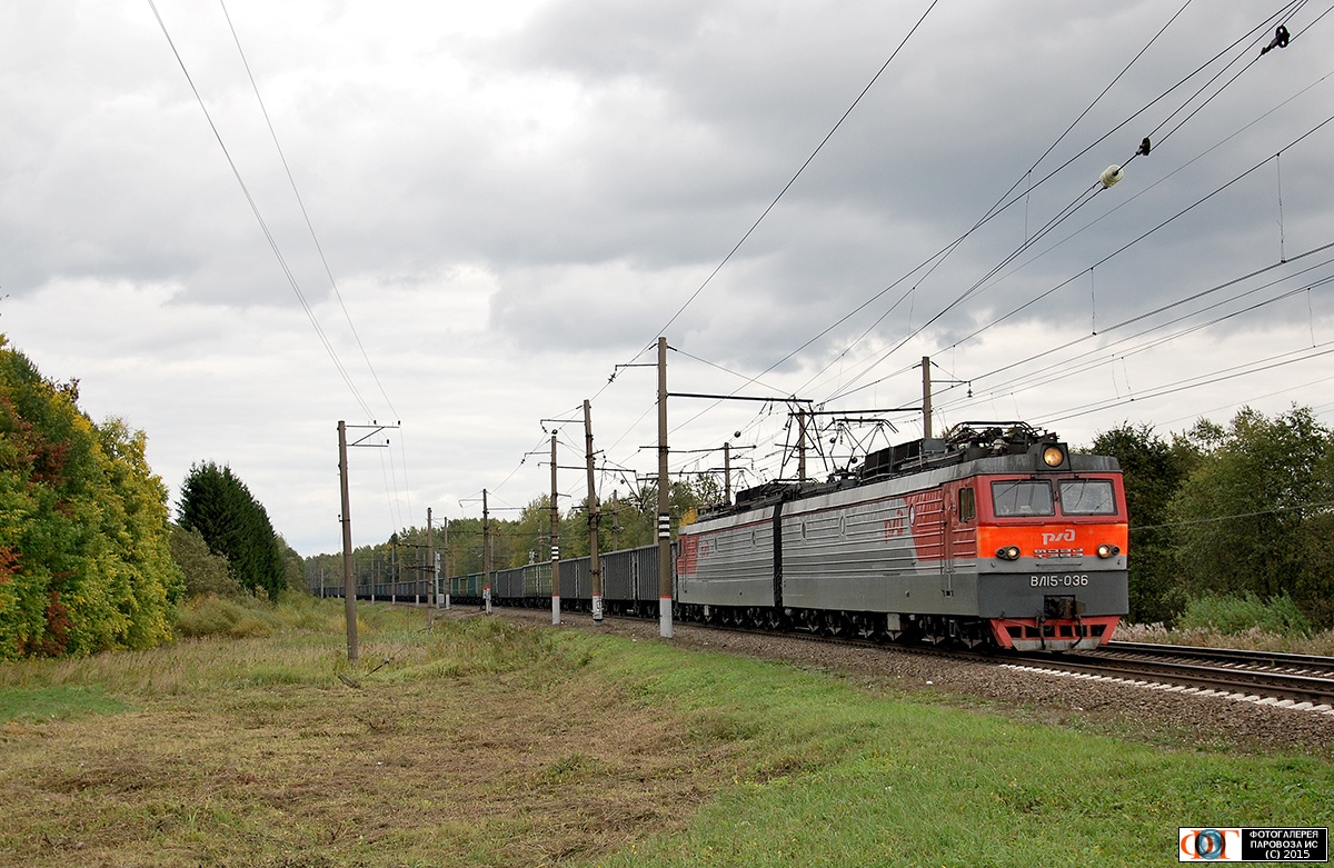 | Электровоз ВЛ15-036 в голове грузового поезда на станции Назия, Окт, Ленинградская обл. Автор: Sedoy | Фото сделано 19.IX.2015, опубликовано 7.X.2015.