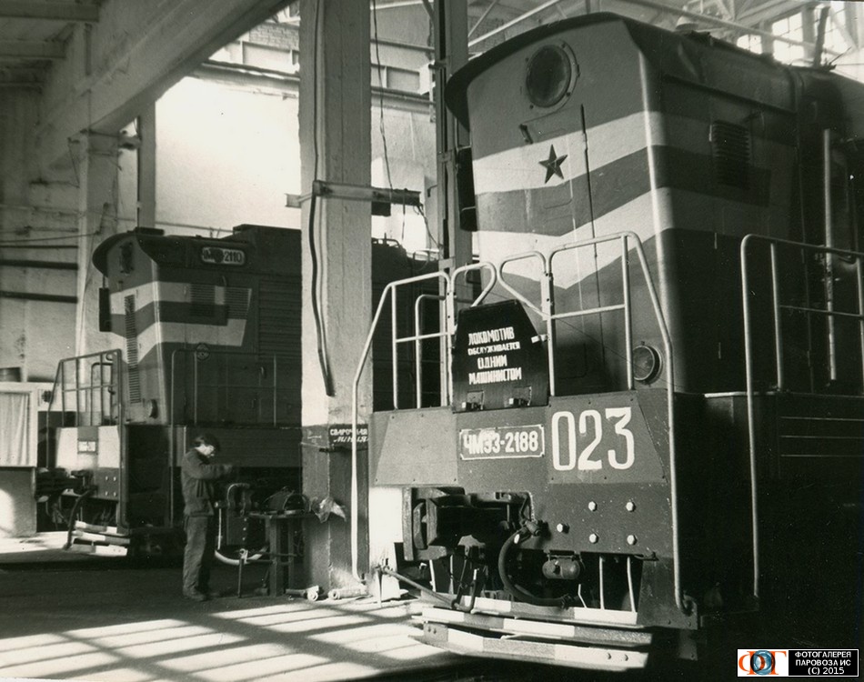 | Тепловозы ЧМЭ3-2110 и ЧМЭ3-2188 в локомотивном депо Орск, Оренбургская обл. Автор: Егор Казаков (колл.) | Фото сделано 198?, опубликовано 12.XII.2015.