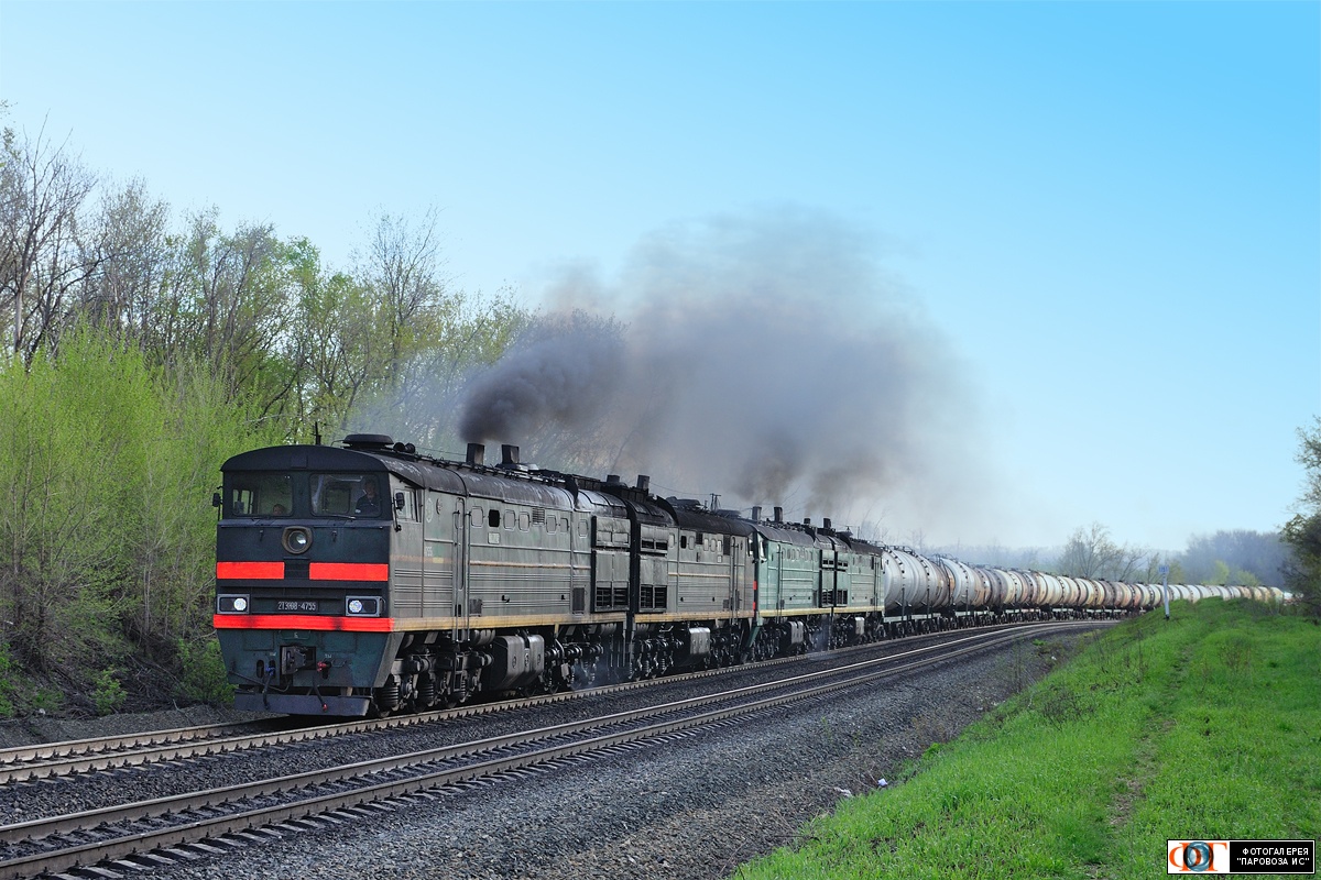 | Тепловоз 2ТЭ10В-4755 и 2ТЭ10М-2577 с грузовым поездом на перегоне Заливная - Богатое, Самарская обл. Автор: Мihail-service | Фото сделано 10.V.2014, опубликовано 20.III.2016.