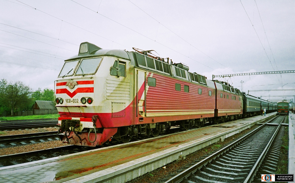 | Электровоз ЧС8-032 с поездом № 13 Харьков - Ужгород на станции Полтава-Киевская ЮЖД, Полтавская обл. Автор: Алексей Краснов | Фото сделано 9.V.2005, опубликовано 27.VIII.2016.