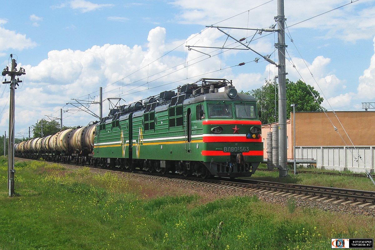 | Электровоз ВЛ80С-563 с грузовым поездом, перегон Жлобин-Западный - Жлобин-Сортировочный, Гомельская обл. Автор: Евгений Пашковский | Фото сделано 27.V.2016, опубликовано 3.XI.2016.