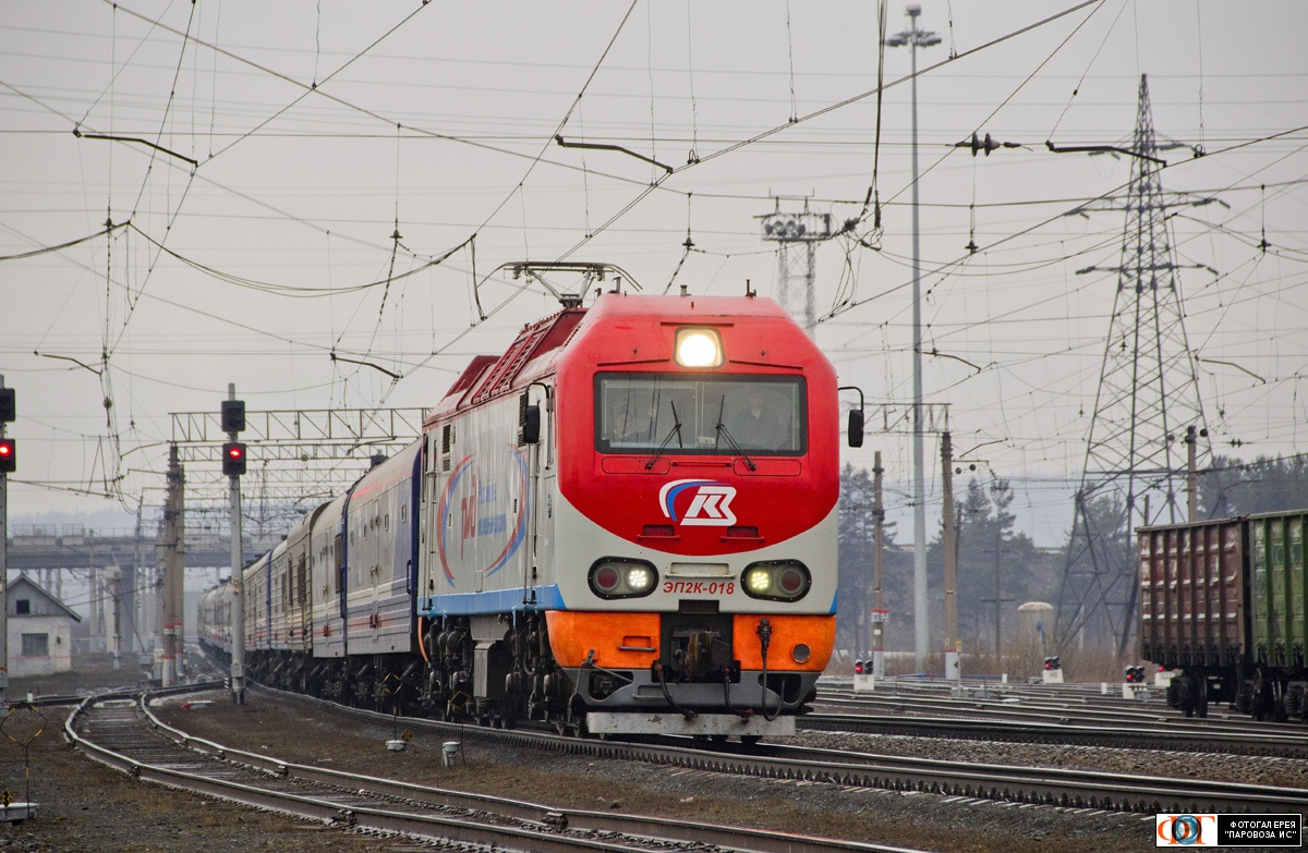 | Электровоз ЭП2К-018 с поездом №990 Москва - Владивосток, станция Ревда, Свердловская обл. Автор: Кирилл Широков | Фото сделано 23.IV.2017, опубликовано 25.IV.2017.